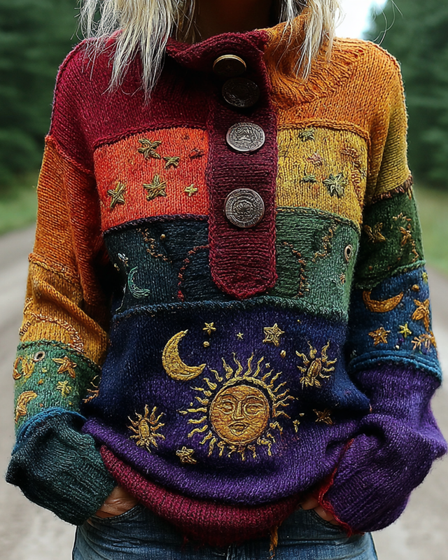 Women's Star and Moon Embroidery Contrast Color Stitching Sweatshirt 7539