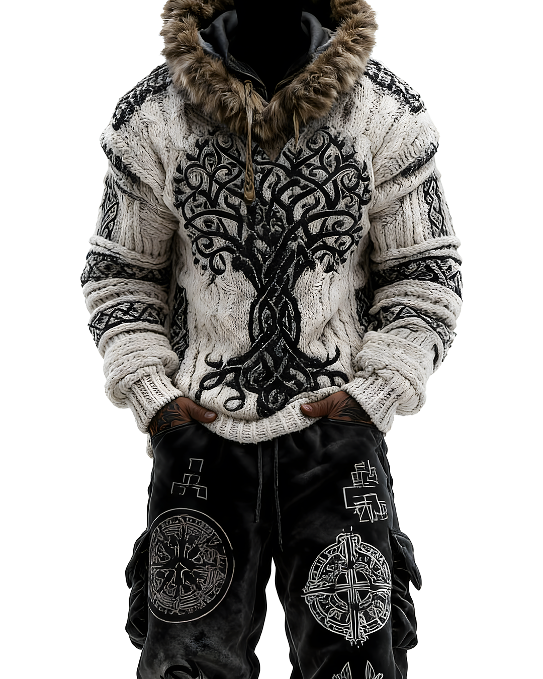 Men's Viking-Style Faux Fur Collar Embroidered Hoodie and Pants Two-Piece Set 3552
