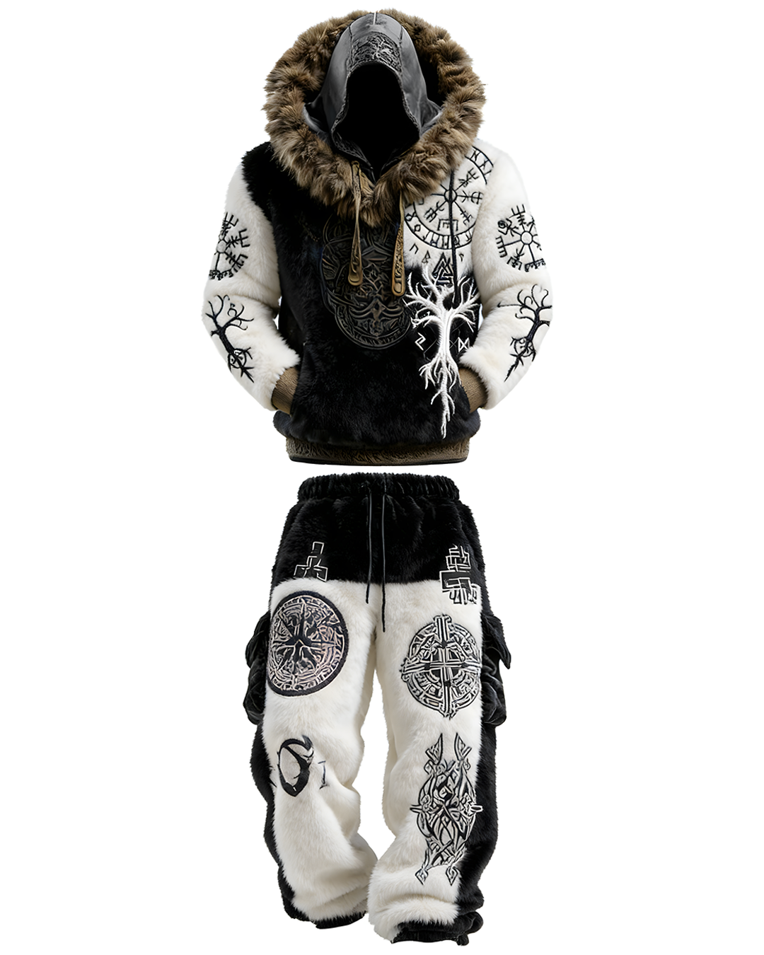 Men's Winter Warmth Color-Block Faux Fur Hoodie and Pants Two-Piece Set 9870