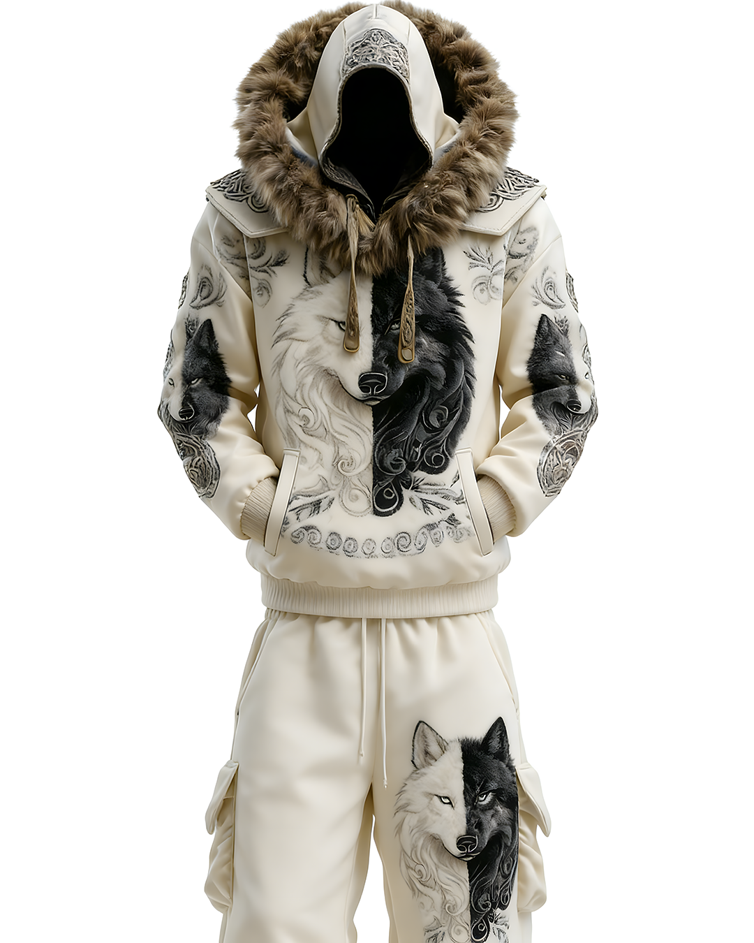 Men's Winter Warmth Wolf Faux Fur Hoodie and Pants Two-Piece Set 7352