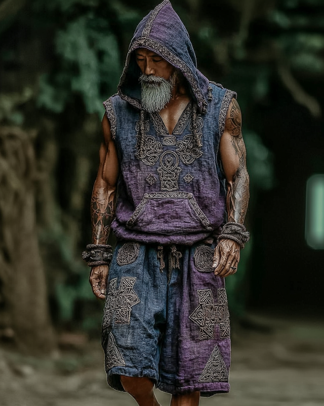 Men's Viking-Style Fashion Gradient Embroidered Hooded Sleeveless Top & Shorts Two-Piece Set 7321