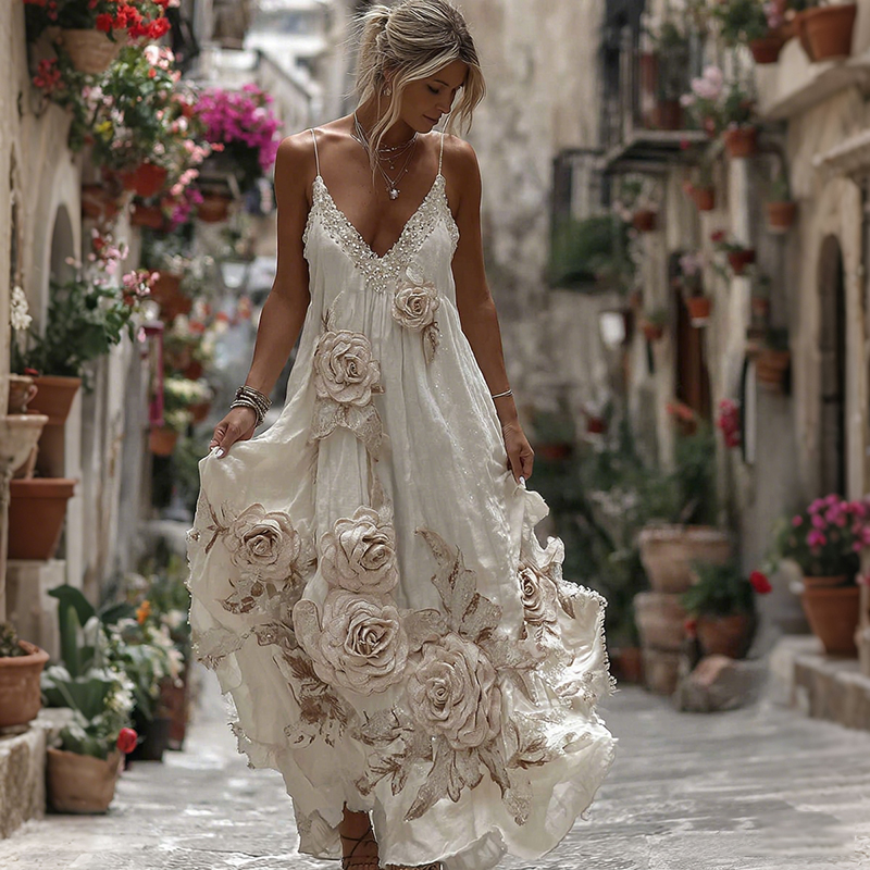 Vintage Boho Floral Art Linen Cami Maxi Dress 764b