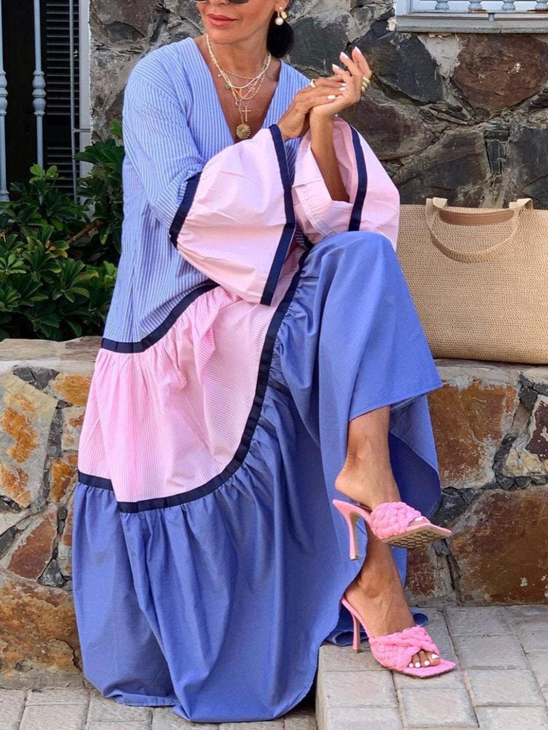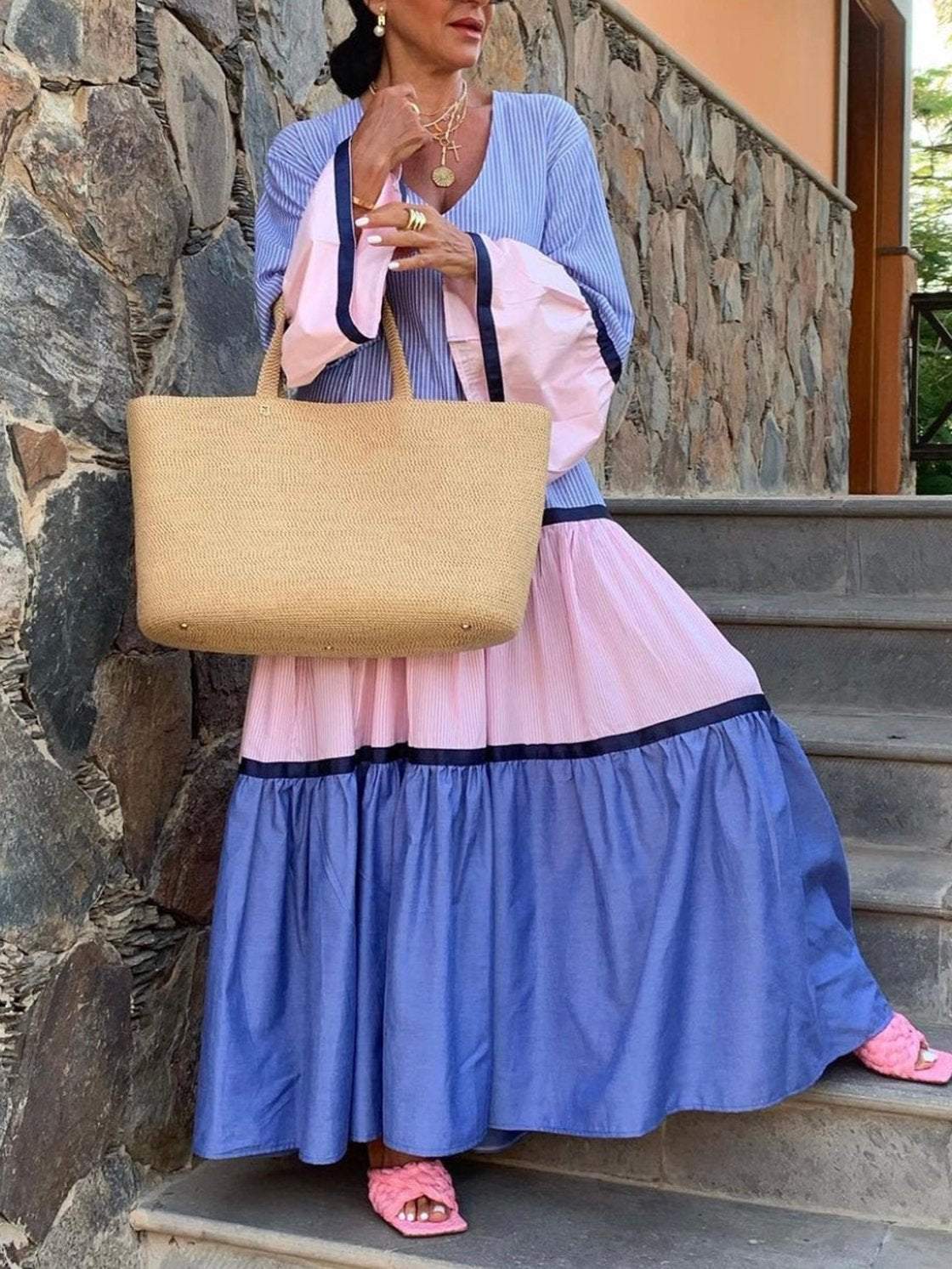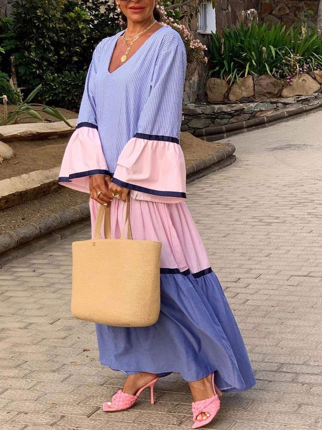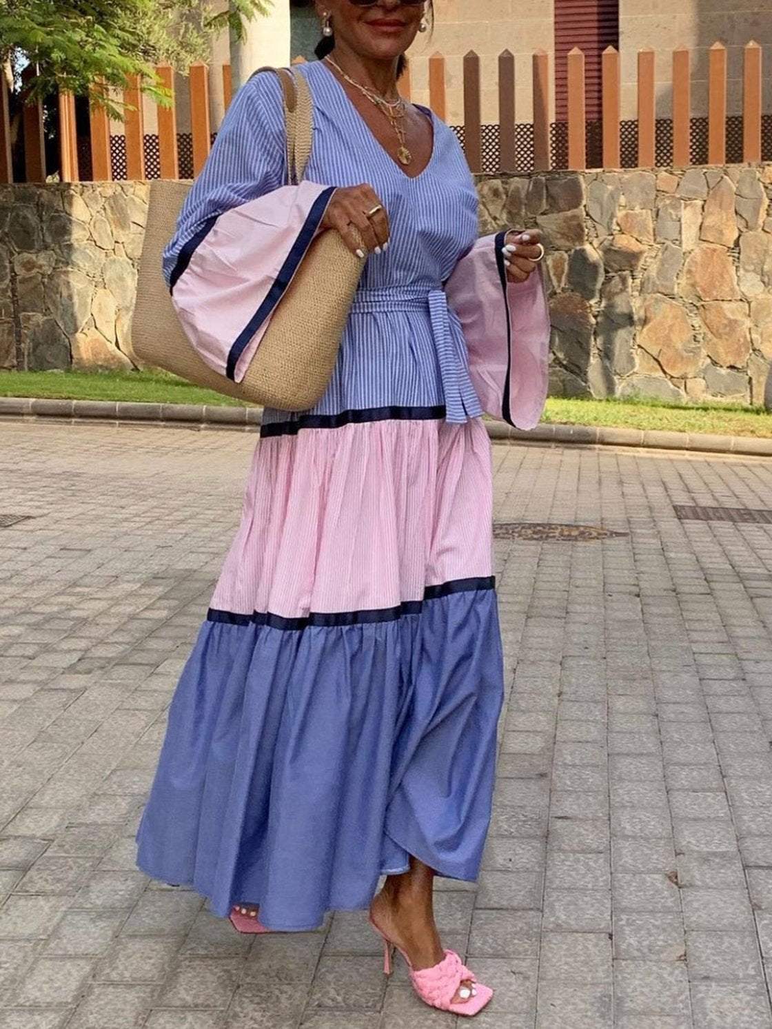 Women's Elegant Vacation Contrast Stripe Long Sleeve Dress 0c50