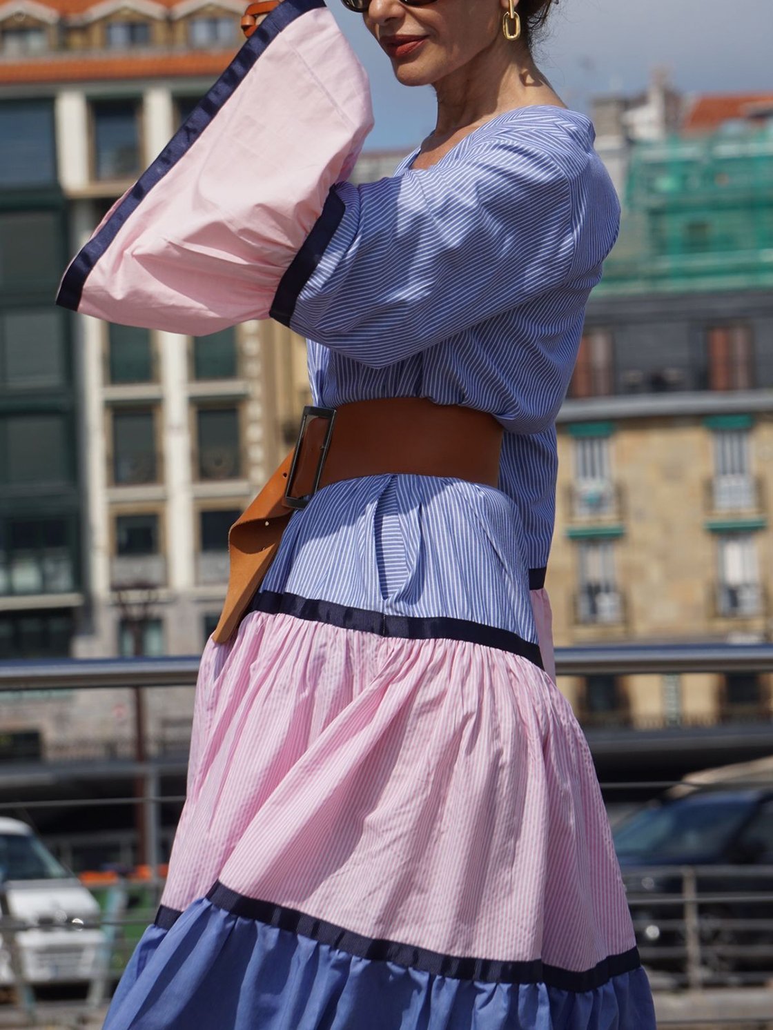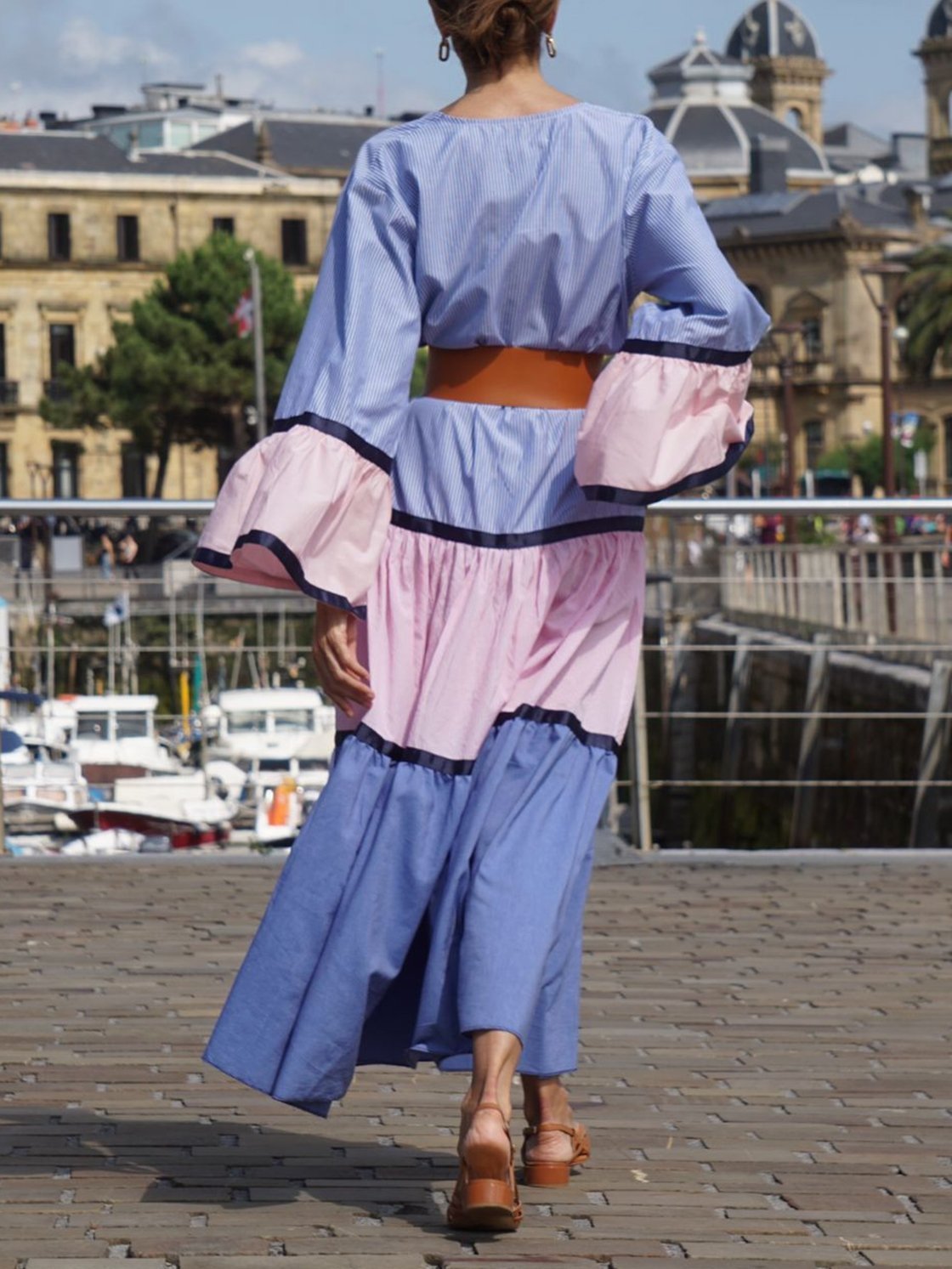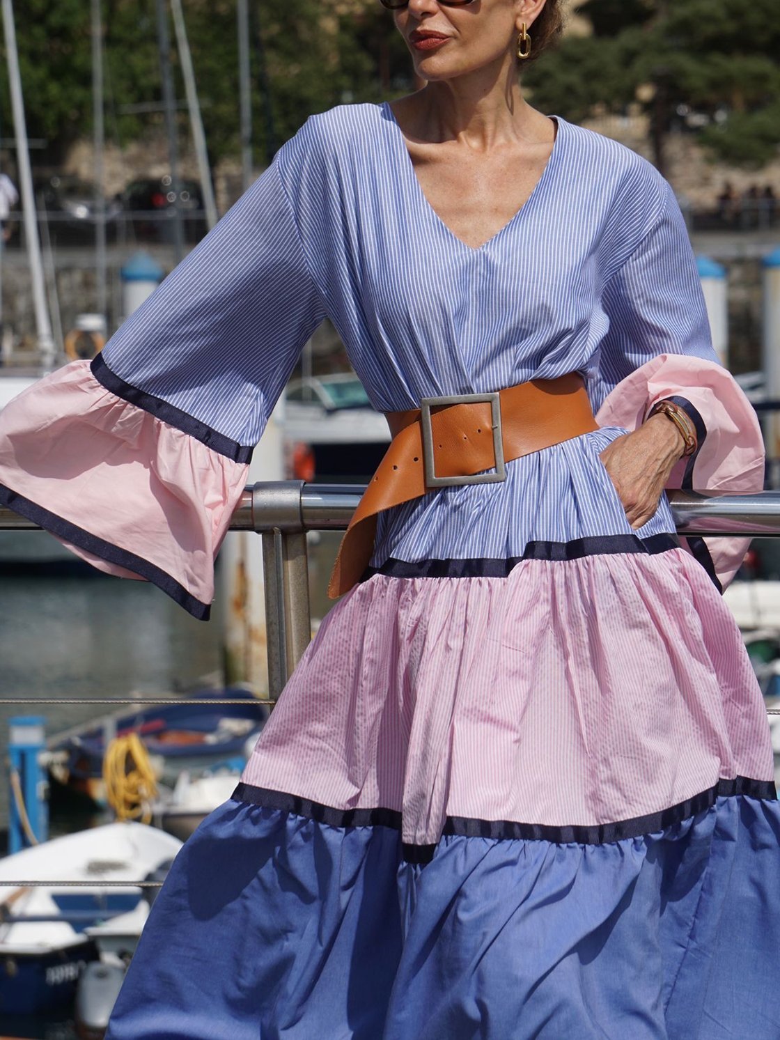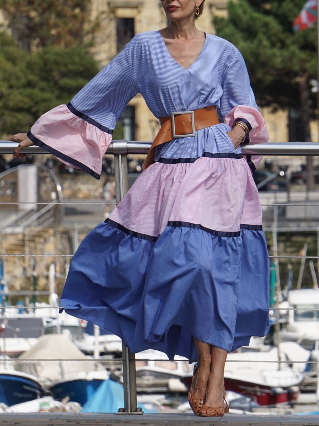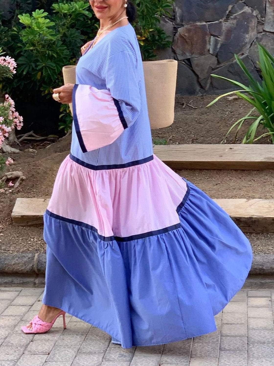 Women's Elegant Vacation Contrast Stripe Long Sleeve Dress 0c50
