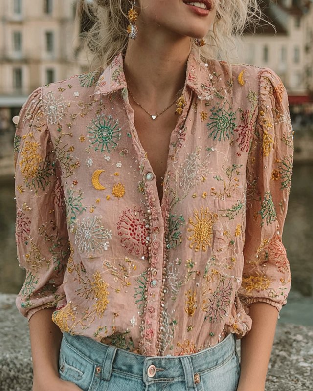 Women's star and moon embroidered hot-beaded shirt 02ec