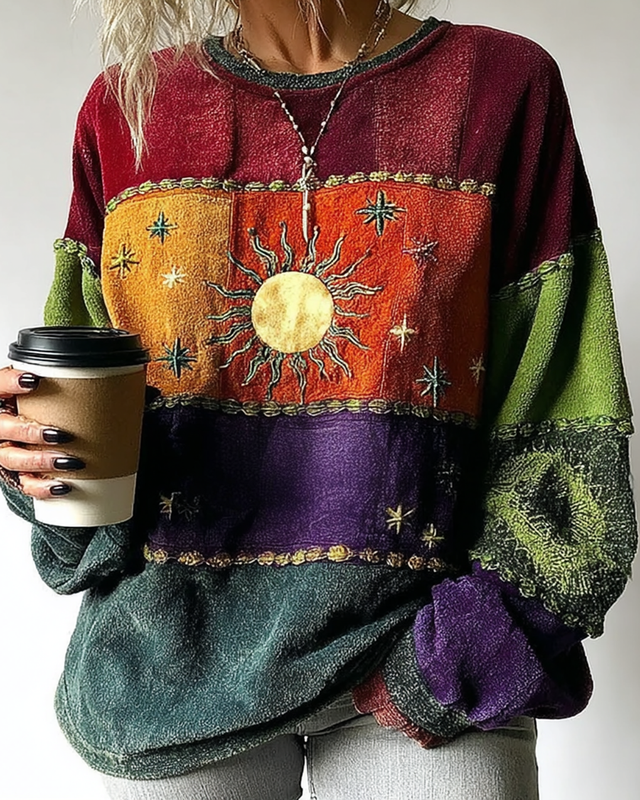 Women's Star and Moon Embroidery Contrast Color Stitching Sweatshirt 7539
