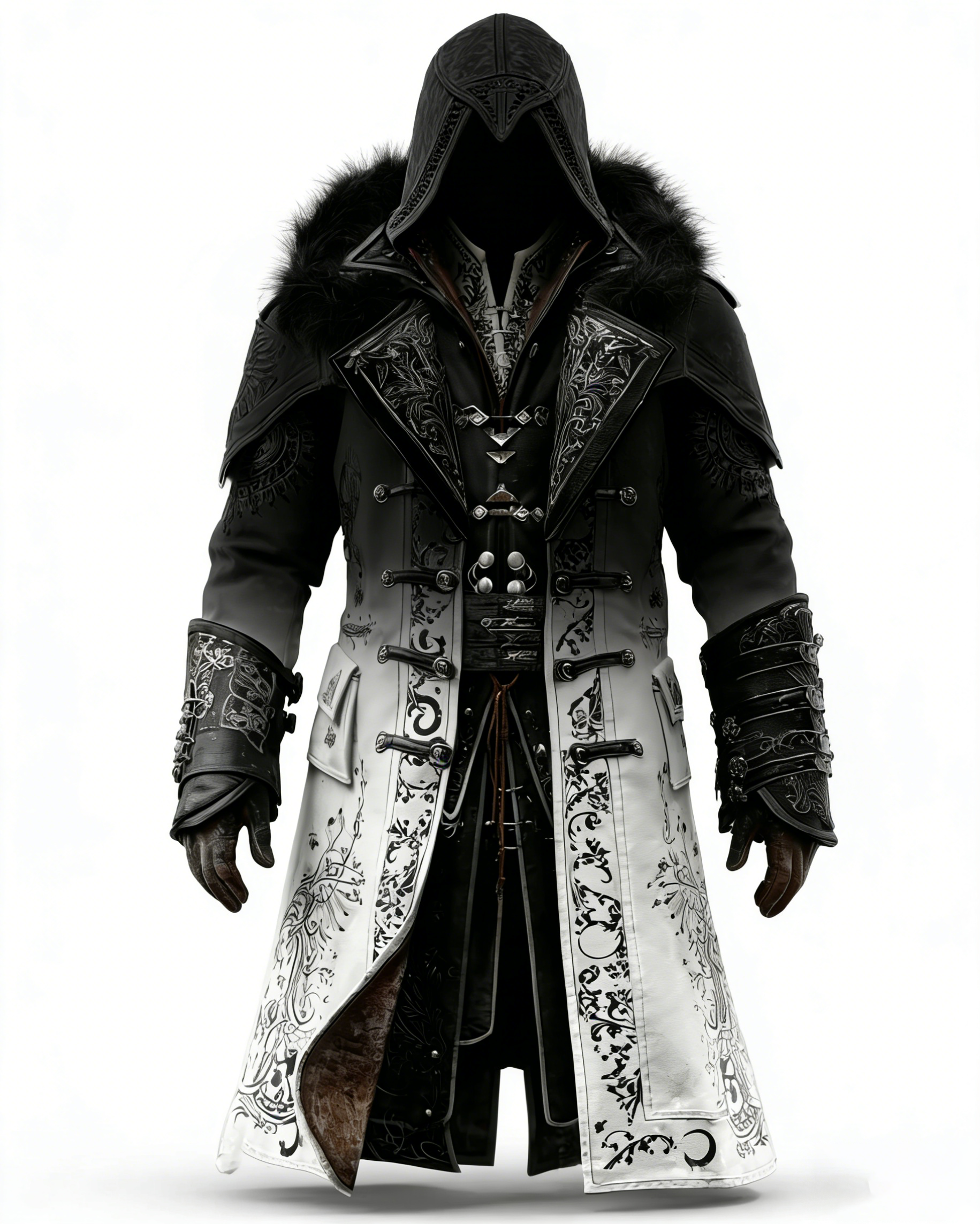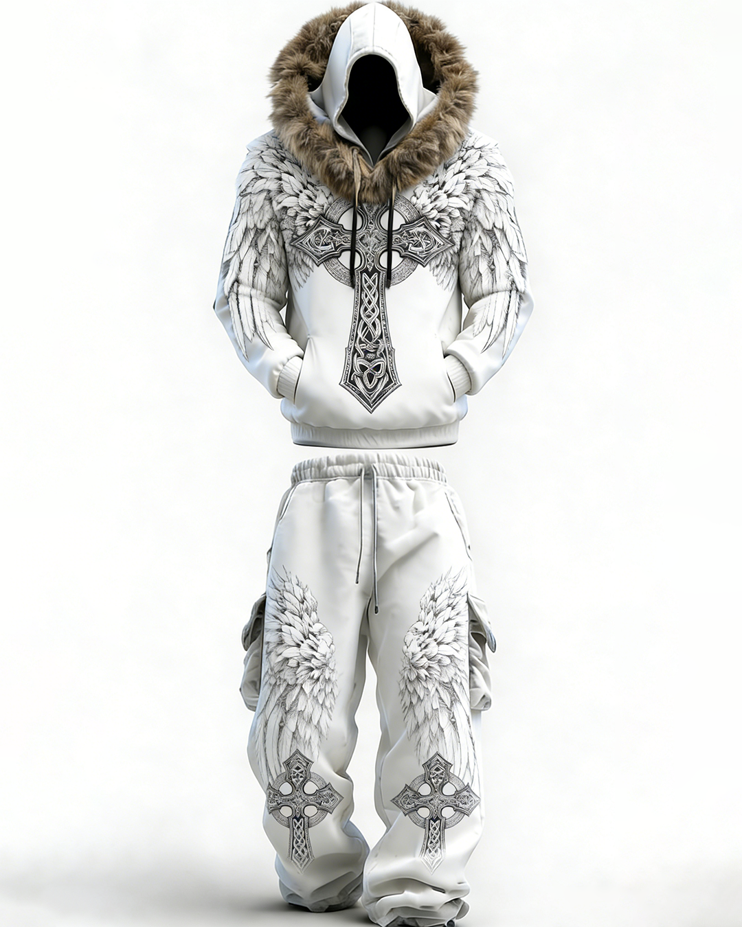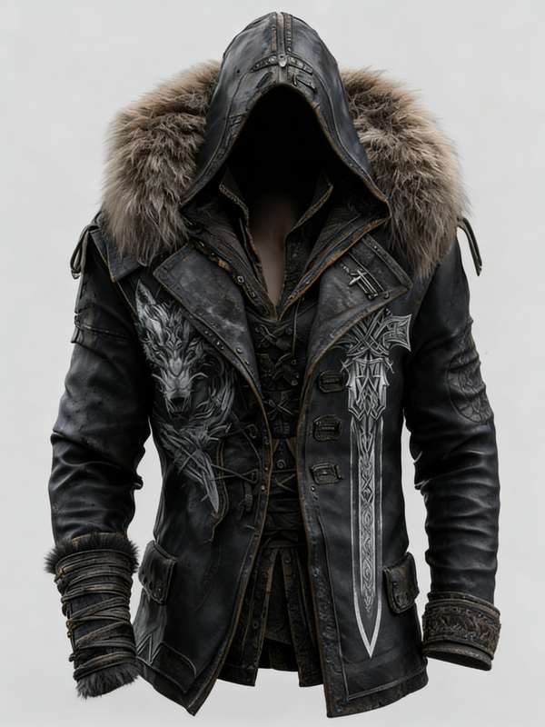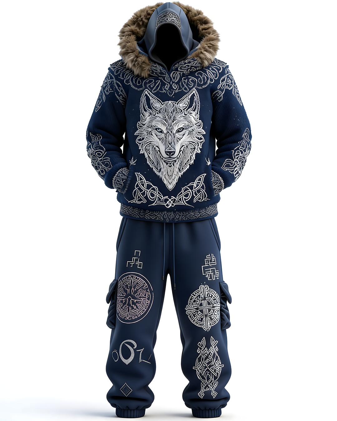 Men's Viking-Style Faux Fur Collar Embroidered Hoodie and Pants Two-Piece Set 3552