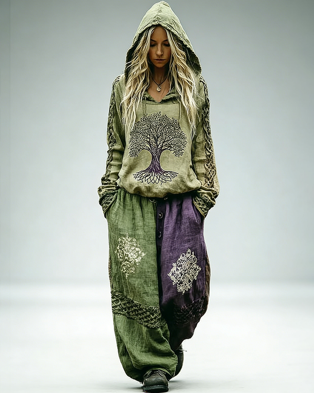 Women's Spring Viking Embroidered Hooded Sweatshirt and Pants Two-Piece Set 4531