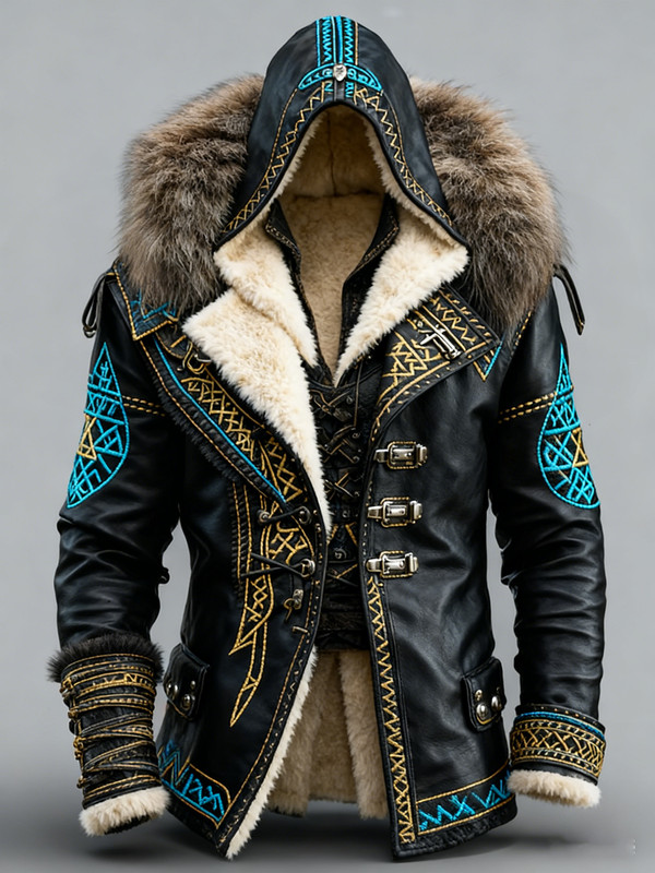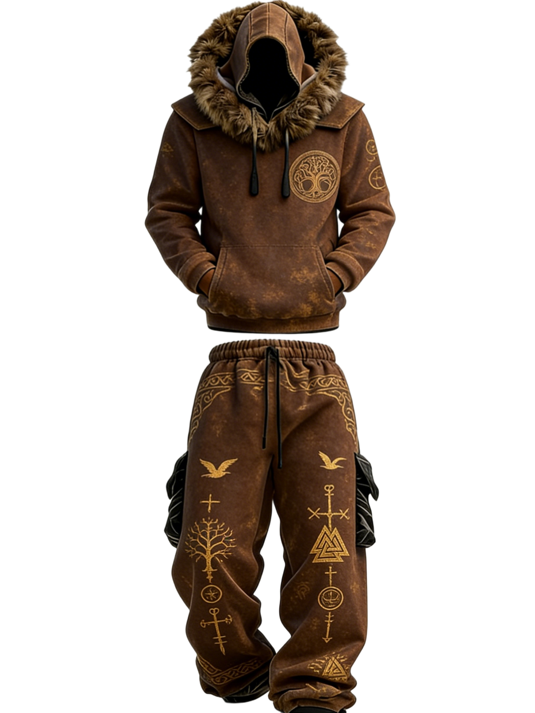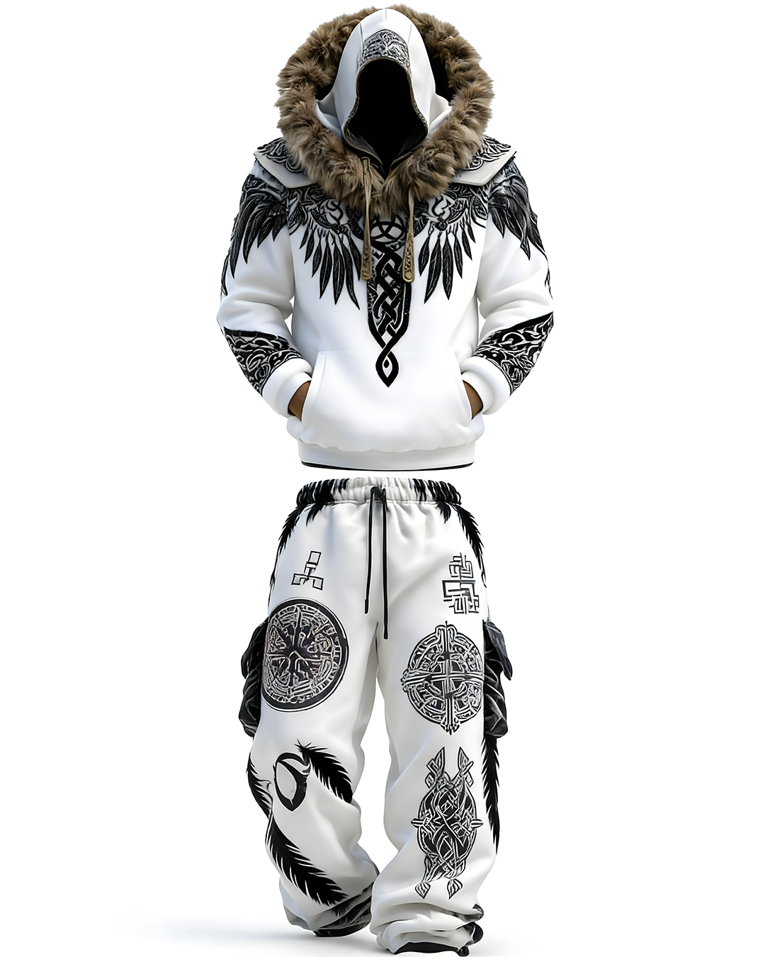 Men's Viking-Style Faux Fur Collar Embroidered Hoodie and Pants Two-Piece Set 9774