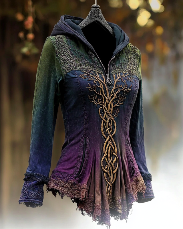 Women's autumn and winter fashion design 1/4 zipper 3D Viking Tree of Life embroidery tie-dye splicing long-sleeved hooded sweatshirt 5602