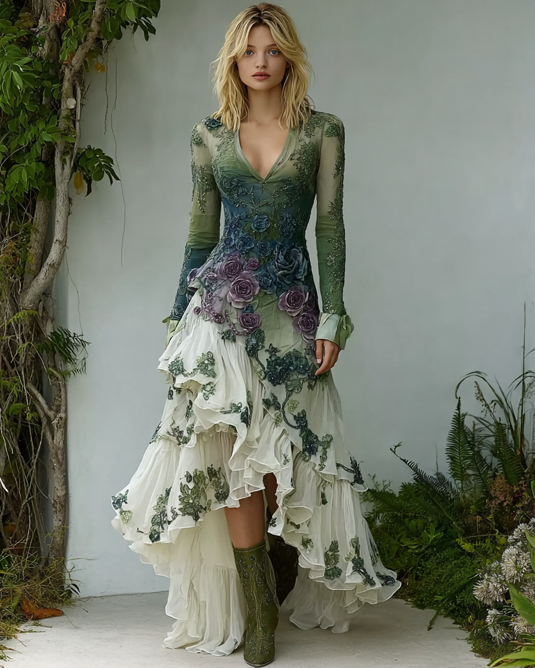 Women's Spring Elegant Gradient Flowers Irregular Ruffle Linen Dress 1248