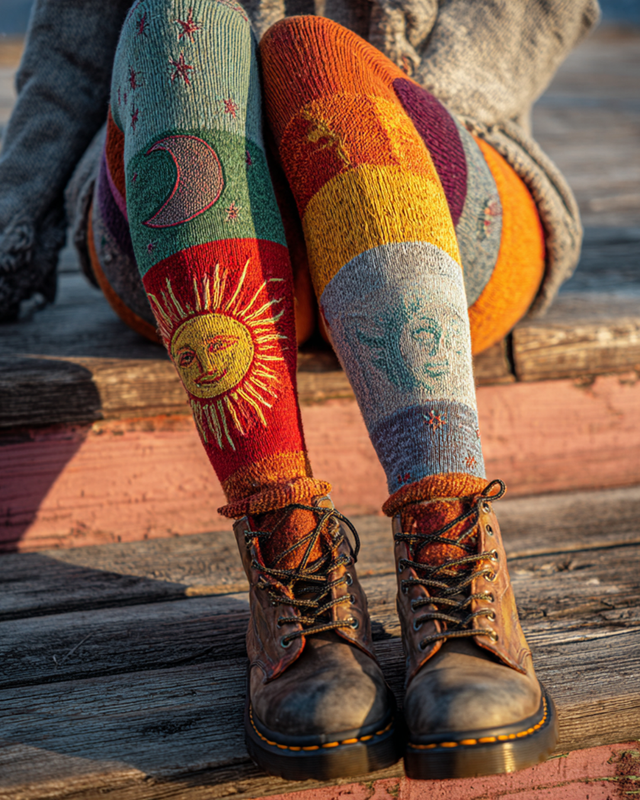 Women's Star and Moon Embroidery Contrast Color Comfortable Knitted Leggings a43e