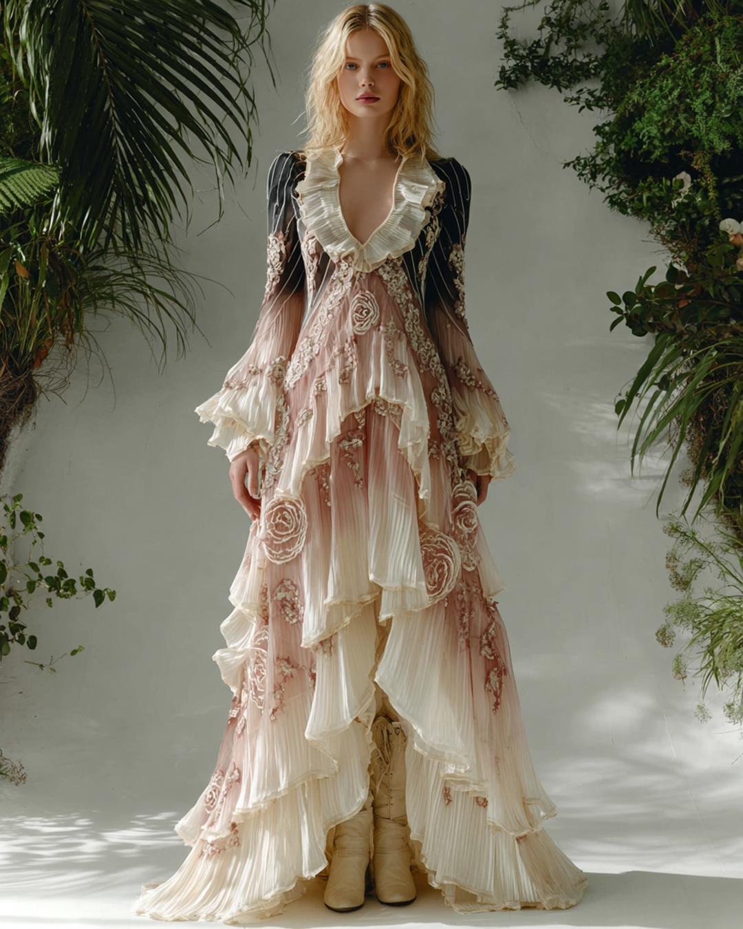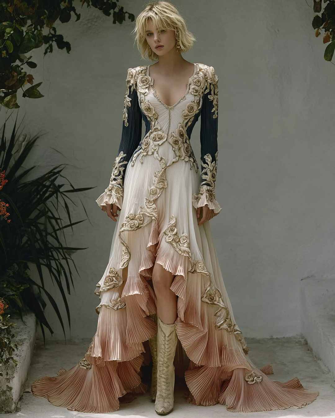 Women's Spring Elegant Gradient Flowers Irregular Ruffle Linen Dress 2188