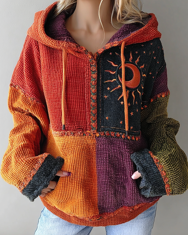 Women's Star and Moon Embroidery Contrast Color Stitching Hooded Sweatshirt 7e21