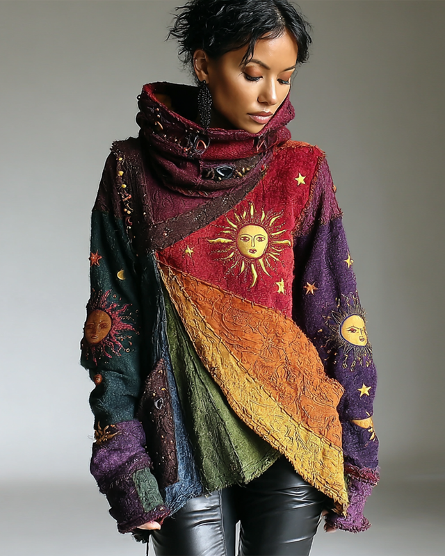 Women's Star and Moon 3D Embroidery Contrast Color Stitching High Neck Original Design Top 2715
