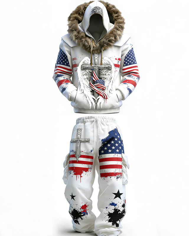 Men's Viking-Style Faux Fur Collar Embroidered Hoodie and Pants Two-Piece Set 3552