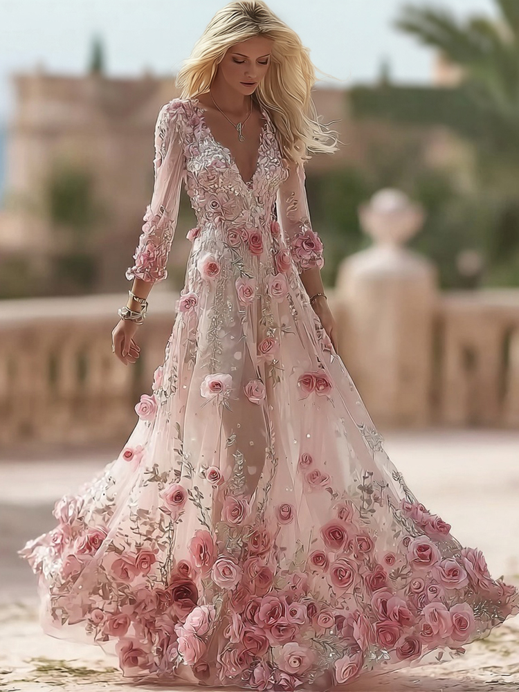 Boho Pink Roses Embroidered V Neck Flowy Maxi Dress 8775