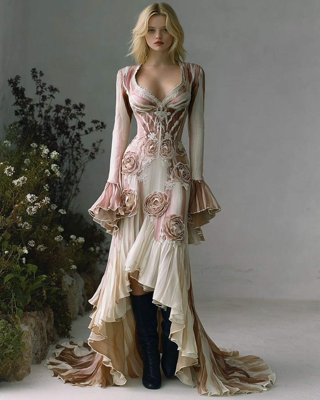 Women's Spring Elegant Flowers Irregular Ruffle Linen Dress 4925