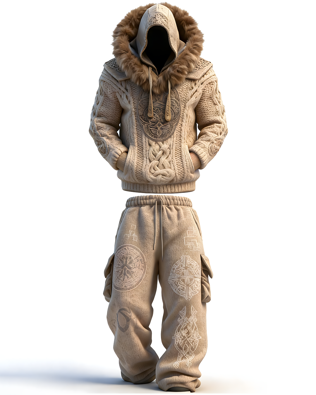 Men's Winter Warmth Knitted Faux Fur Hoodie and Pants Two-Piece Set 9983