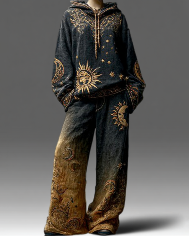 Women's Spring Viking Gradient Star-Moon Embroidered Patchwork Cotton-Linen Hooded Sweatshirt and Pants Two-Piece Set 1329
