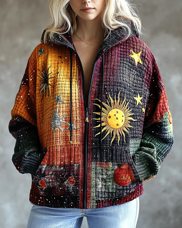 Women's 3D Star and Moon Embroidery Tie-Dye Waffle Hooded Sweatshirt Jacket 5e93