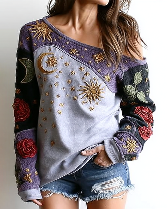 Women's star and moon embroidered contrasting color stitching knitted off-shoulder top 41eb