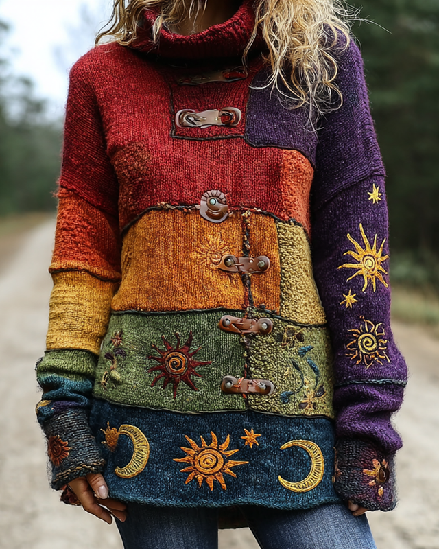 Women's star and moon embroidered contrasting color stitching high-neck long-sleeved top b3f6