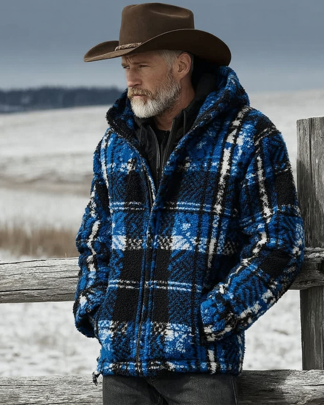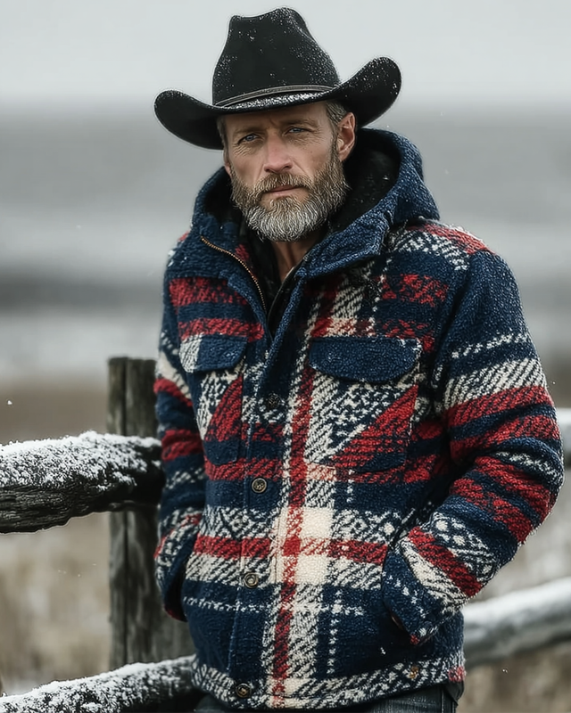 Men's Western Ethnic Style Plaid Print Warm and Stylish Hooded Jacket 2402