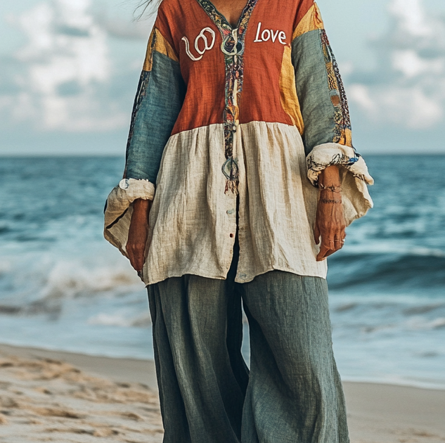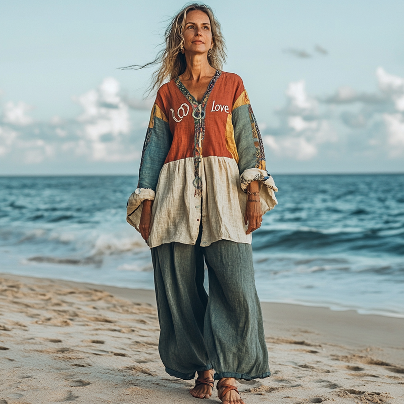 Comfort Vacation Oversized Linen Long Sleeve Shirt and Wide Leg Pants fc63