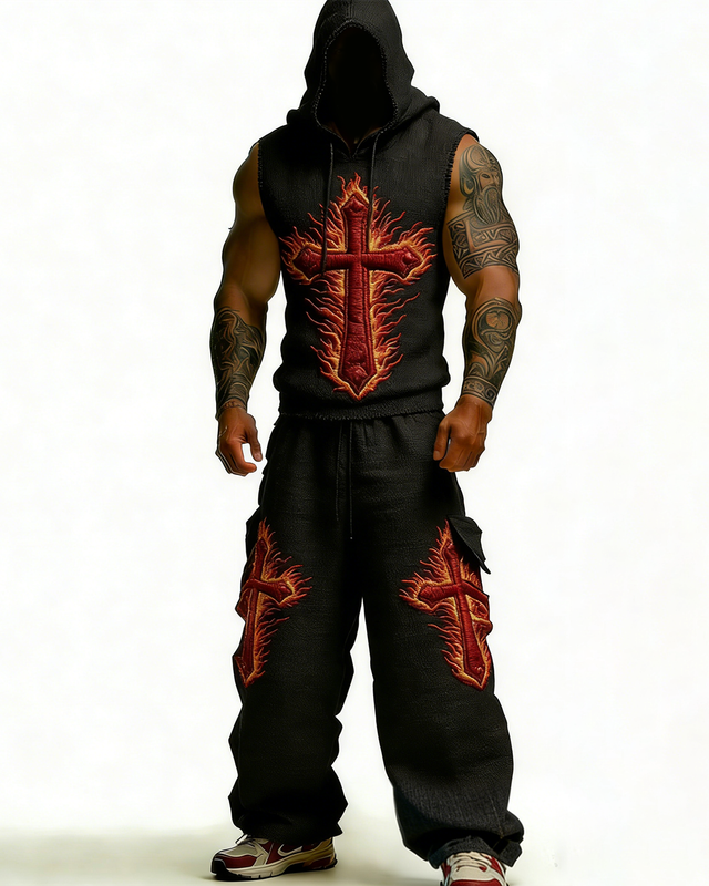 Men's Nordic Viking style cross-decorated top and trousers two-piece set 9866