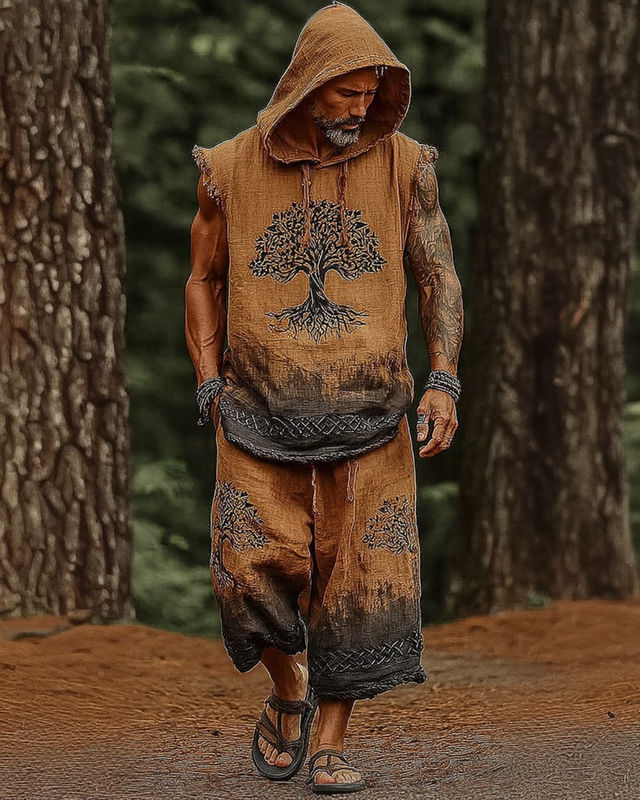 Men's Viking-Style Fashion Contrast-Color Embroidered Hooded Sleeveless Top & Shorts Two-Piece Set 5476