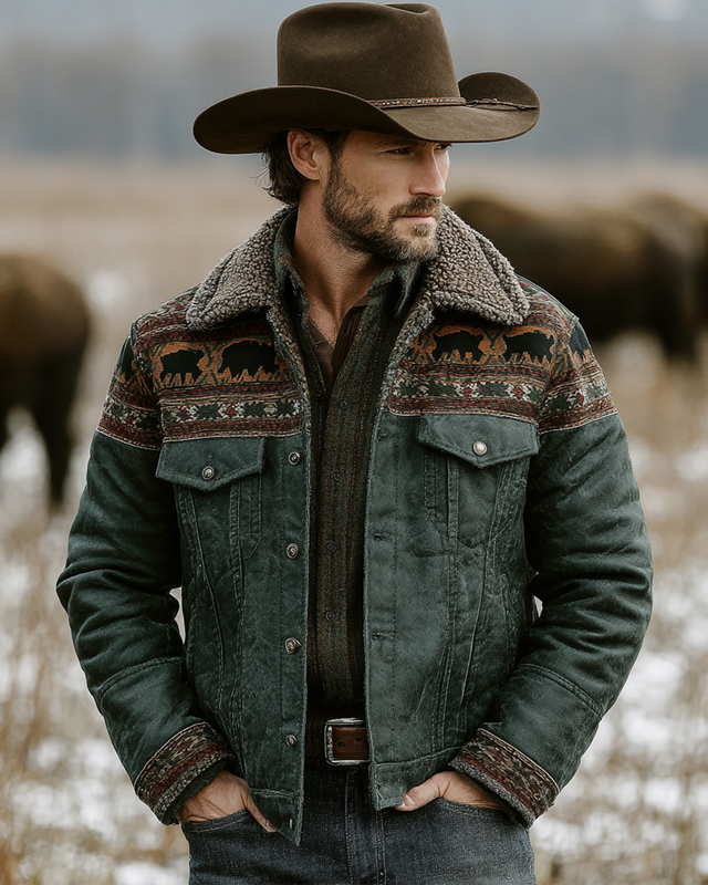 Men's Western Aztec Style Printed Warm Wool Collar Leather Jacket 4083