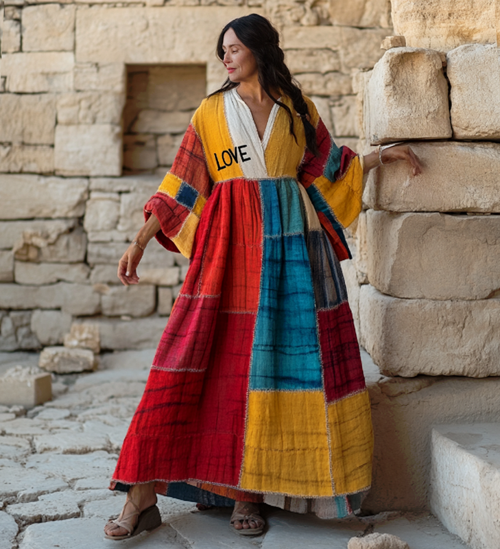 Vintage Loose Linen Patchwork Rainbow Contrast Dress 3116