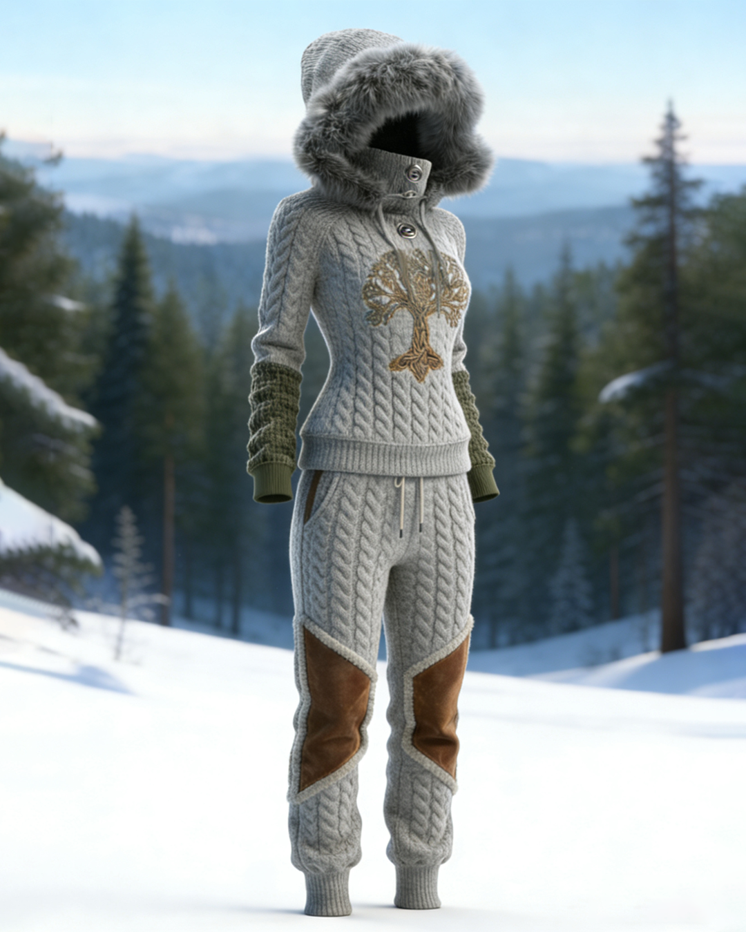 Women's Winter Warmth Tree of Life Faux Fur Hoodie and Pants Two-Piece Set 2424
