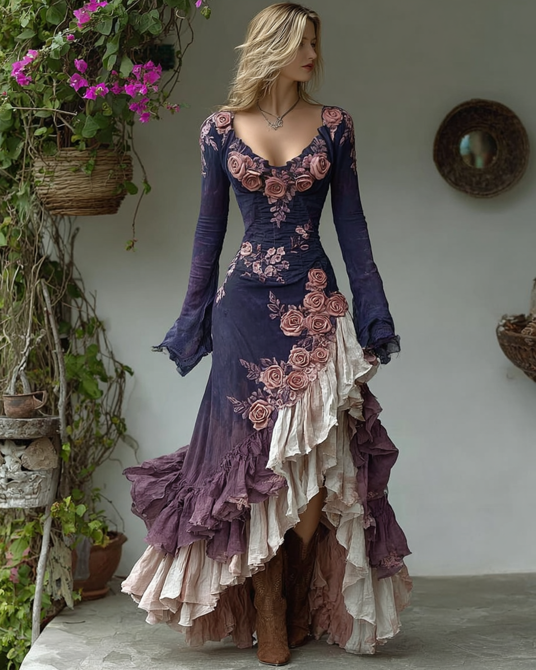 Women's Spring Elegant Gradient Flowers Irregular Ruffle Linen Dress 3679
