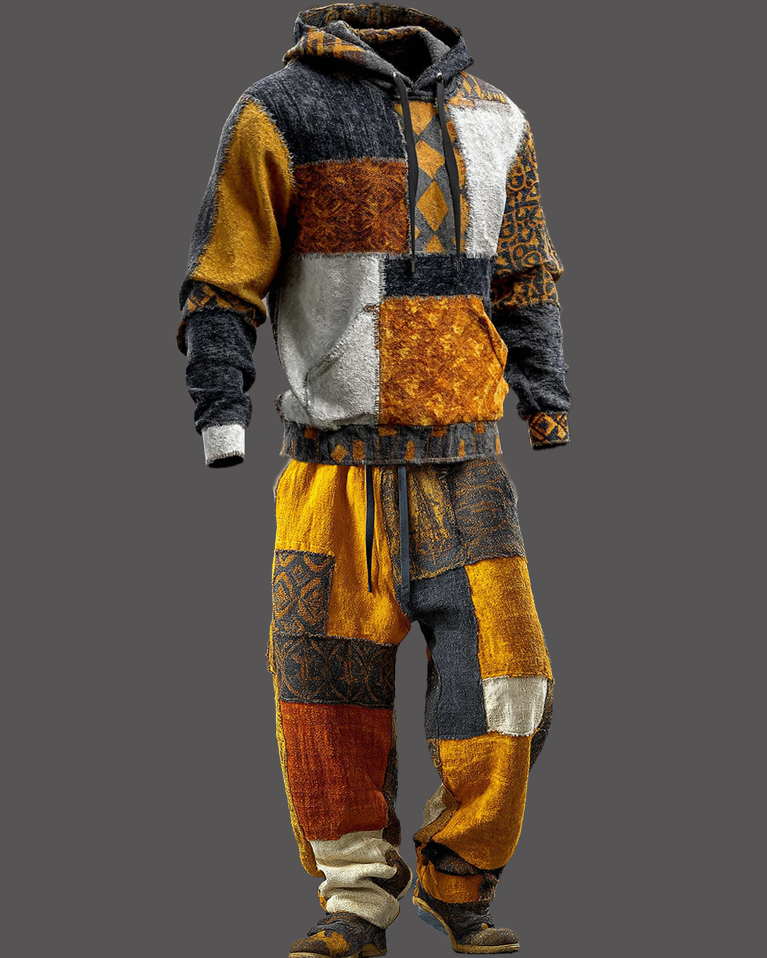 Men's Viking-Style Faux Fur Collar Embroidered Hoodie and Pants Two-Piece Set 3552