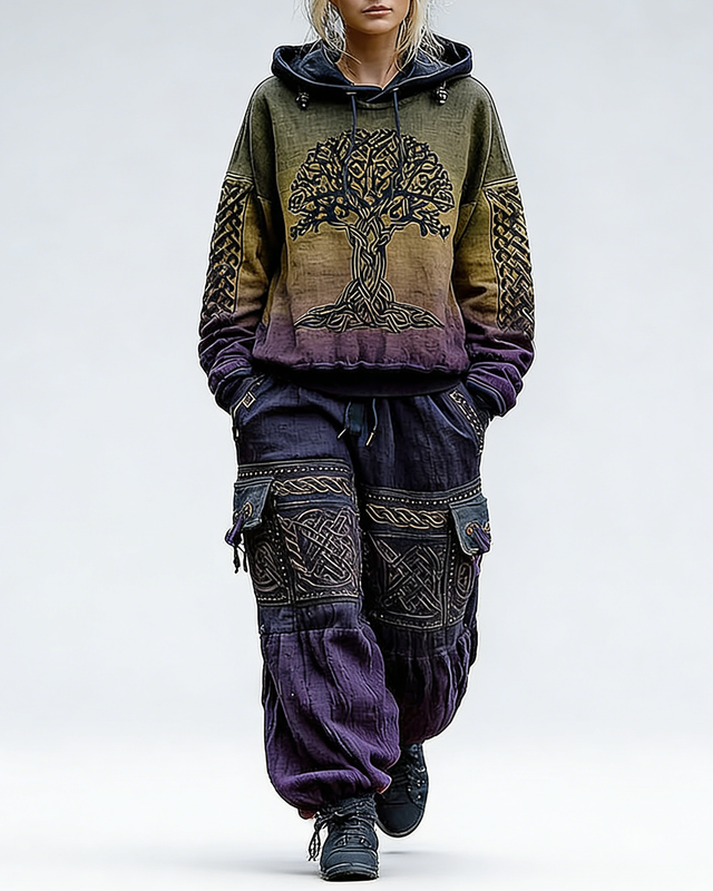 Women's Spring Viking Gradient Embroidered Cotton-Linen Hooded Sweatshirt and Pants Two-Piece Set 7675