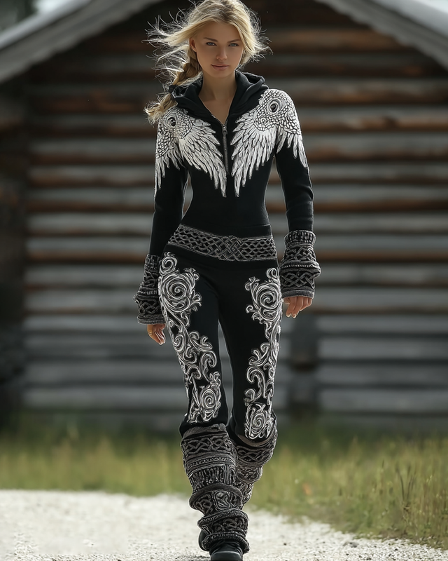 Women's Spring Viking Embroidered Hooded Sweatshirt and Pants Two-Piece Set 9476