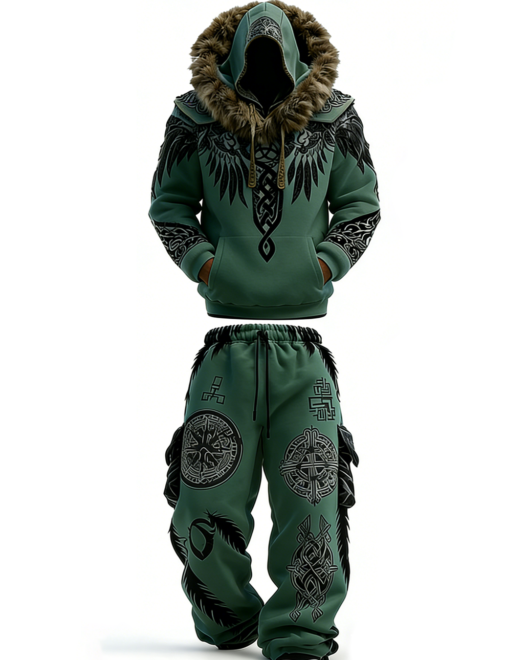 Men's Winter Warmth Green Faux Fur Hoodie and Pants Two-Piece Set 5334