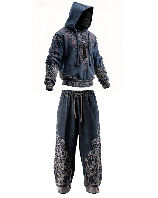 Men's Spring Viking-themed embroidered cotton and linen hooded sweatshirt and trousers two-piece set 7663