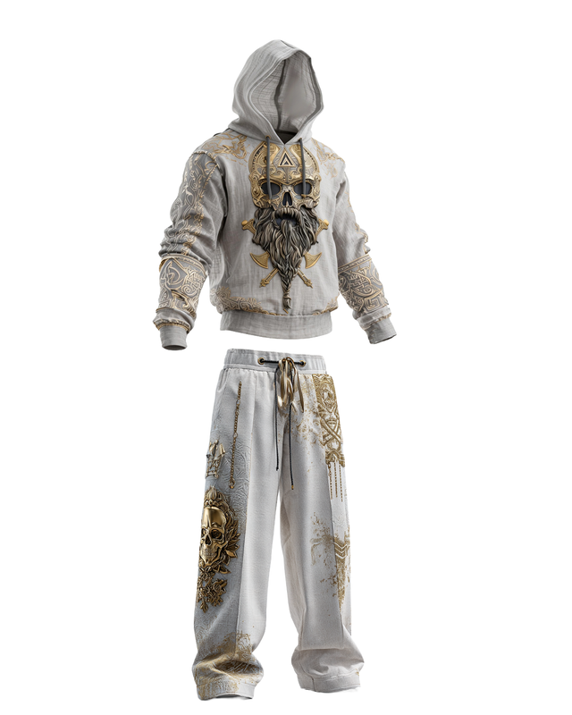 Men's Spring Viking-themed embroidered cotton and linen hooded sweatshirt and trousers two-piece set 8364