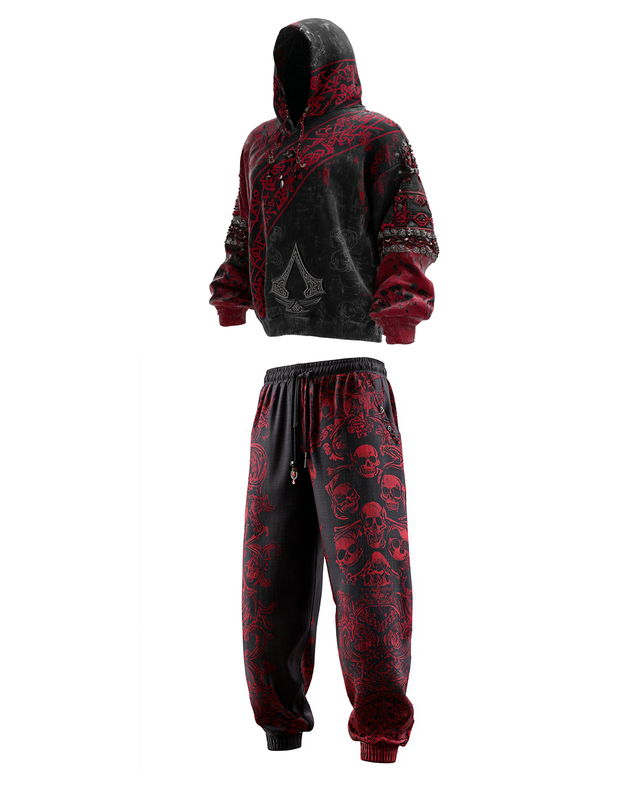 Men's Spring Viking-themed embroidered cotton and linen hooded sweatshirt and trousers two-piece set 8436